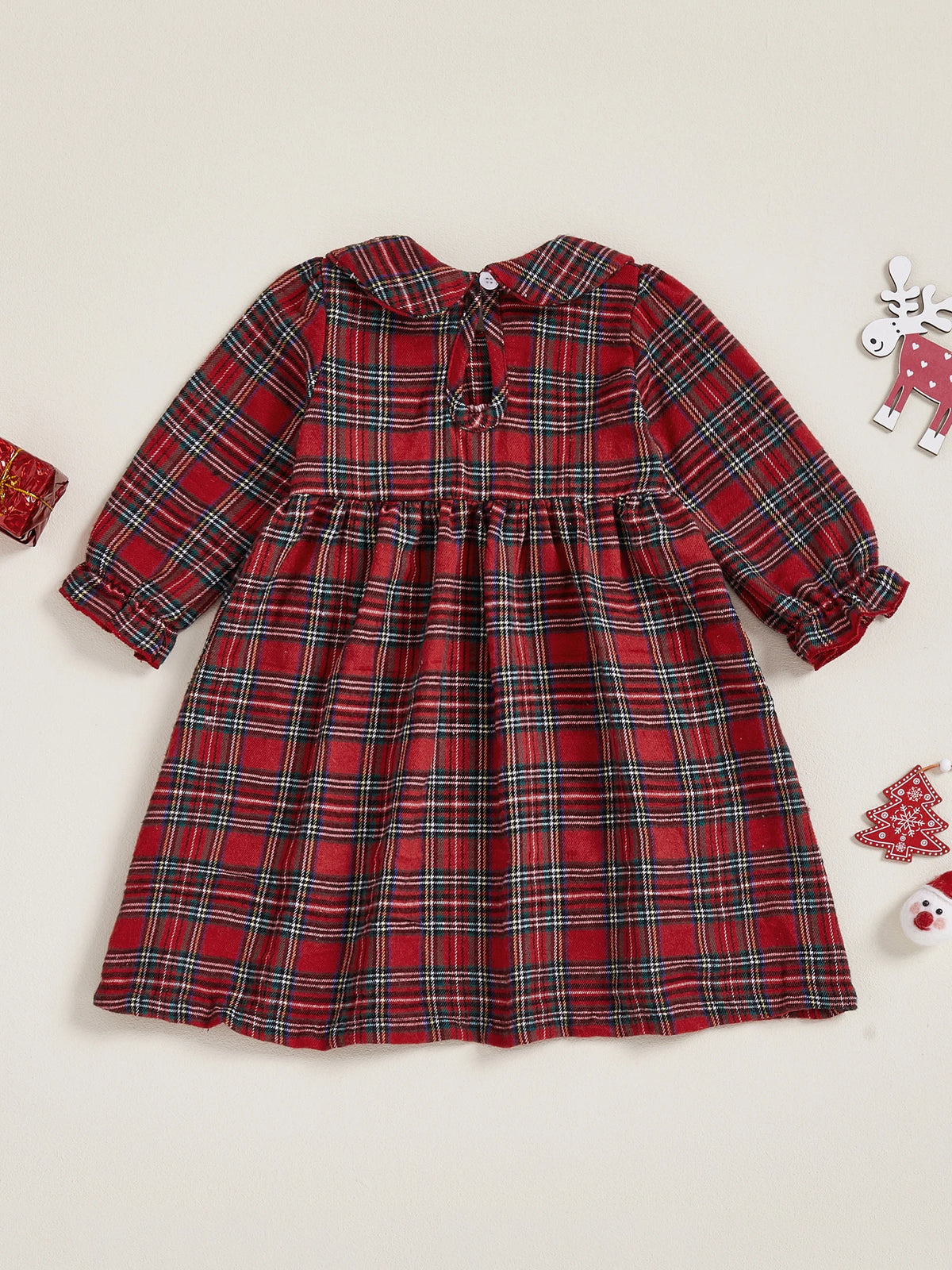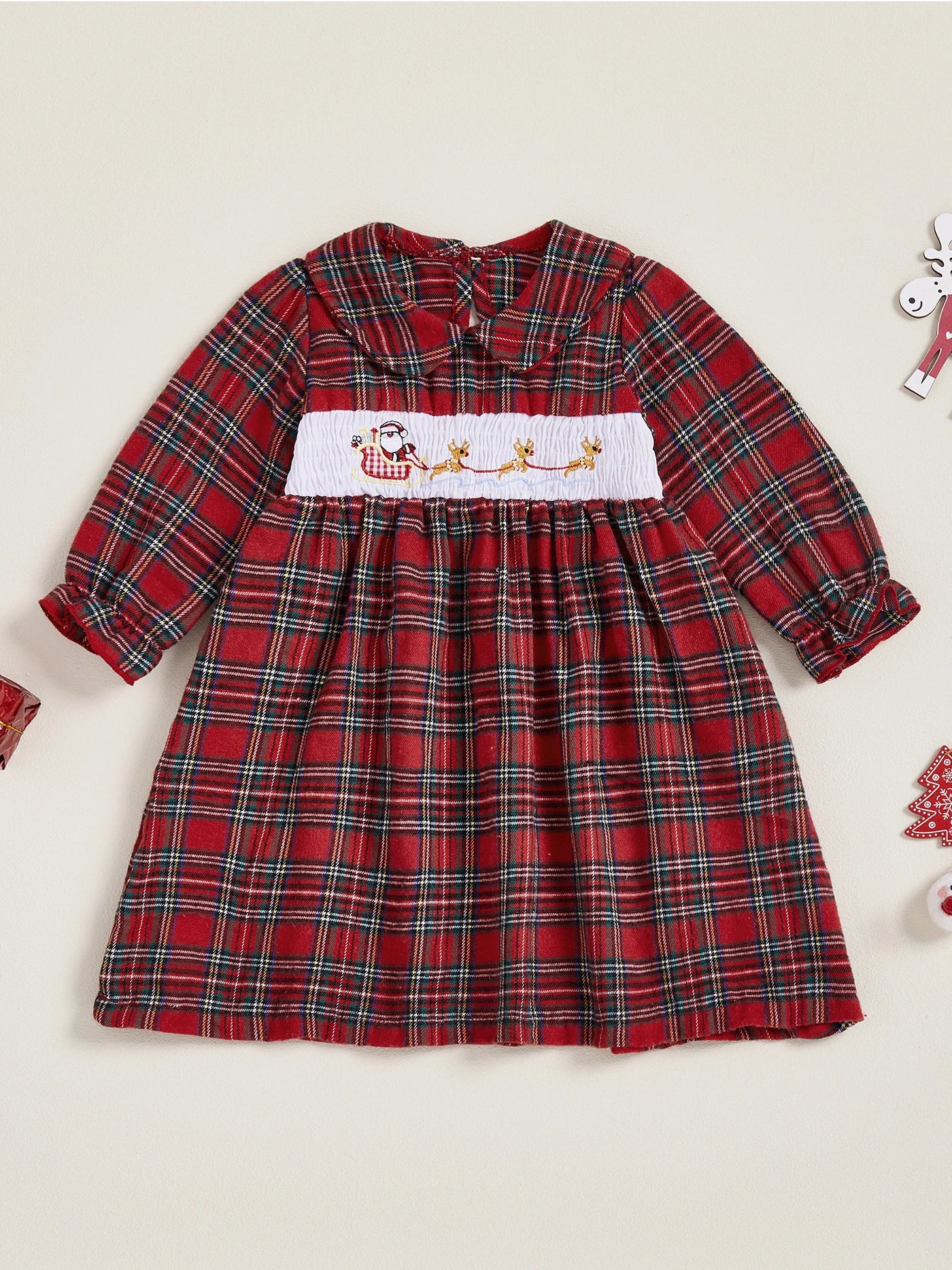 Inform when this item available Christmas Plaid Dress with Santa and Reindeer Embroidery Doll Collar Long Sleeves A-line Silhouette - Adorable Winter and
