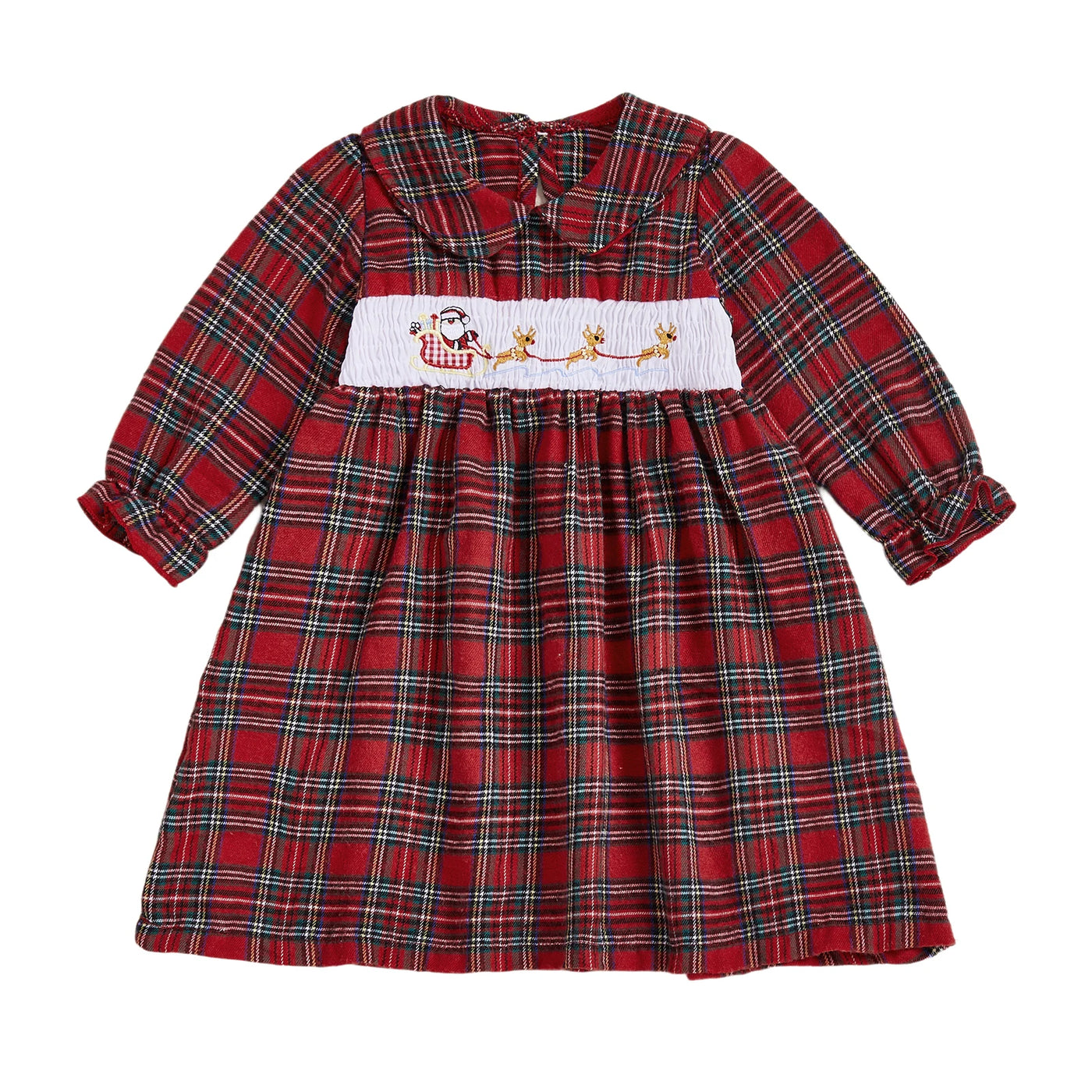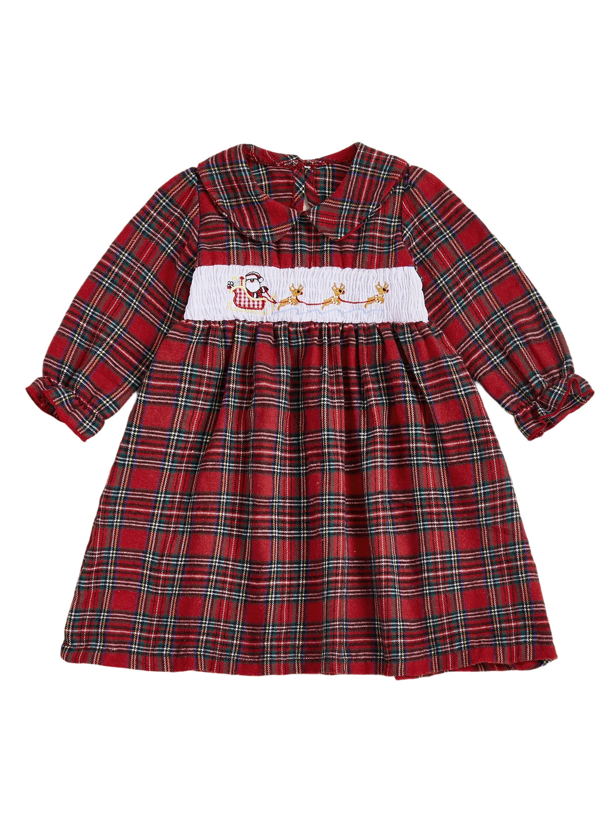 Christmas Plaid Dress with Santa and Reindeer Embroidery Doll Collar Long Sleeves A-line Silhouette - Adorable Winter and - Red / 3-4 Years