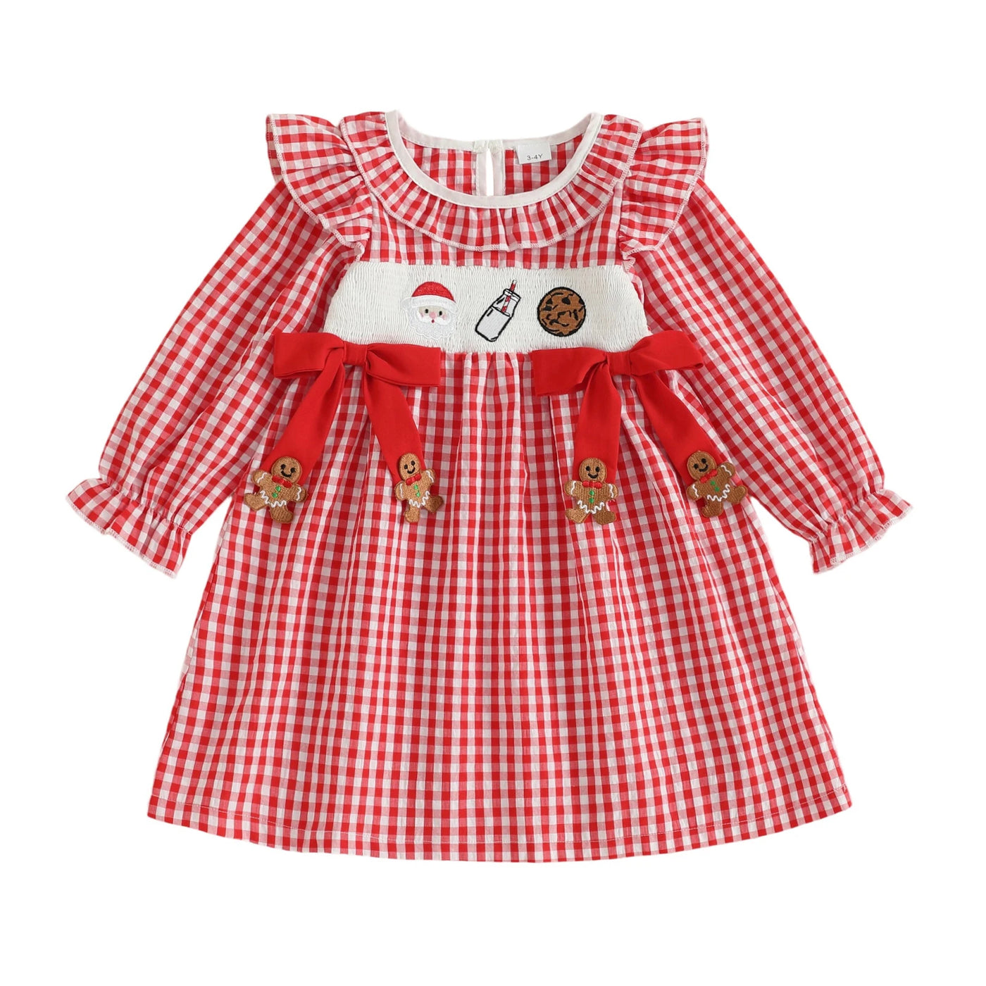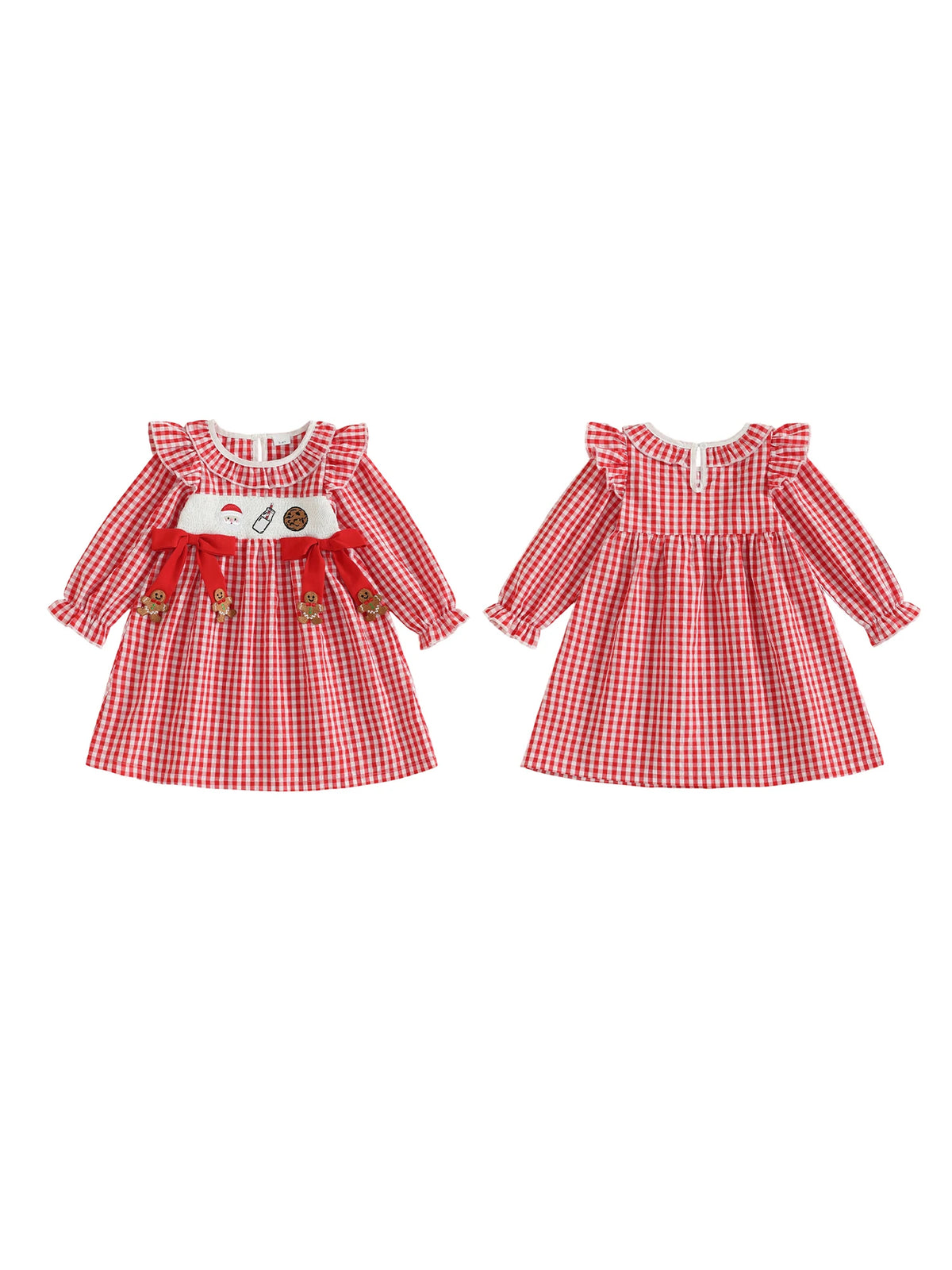 Girls Christmas Dress Long Sleeve Crew Neck Plaid Embroidery Santa Claus Winter Dress with Bow Detail