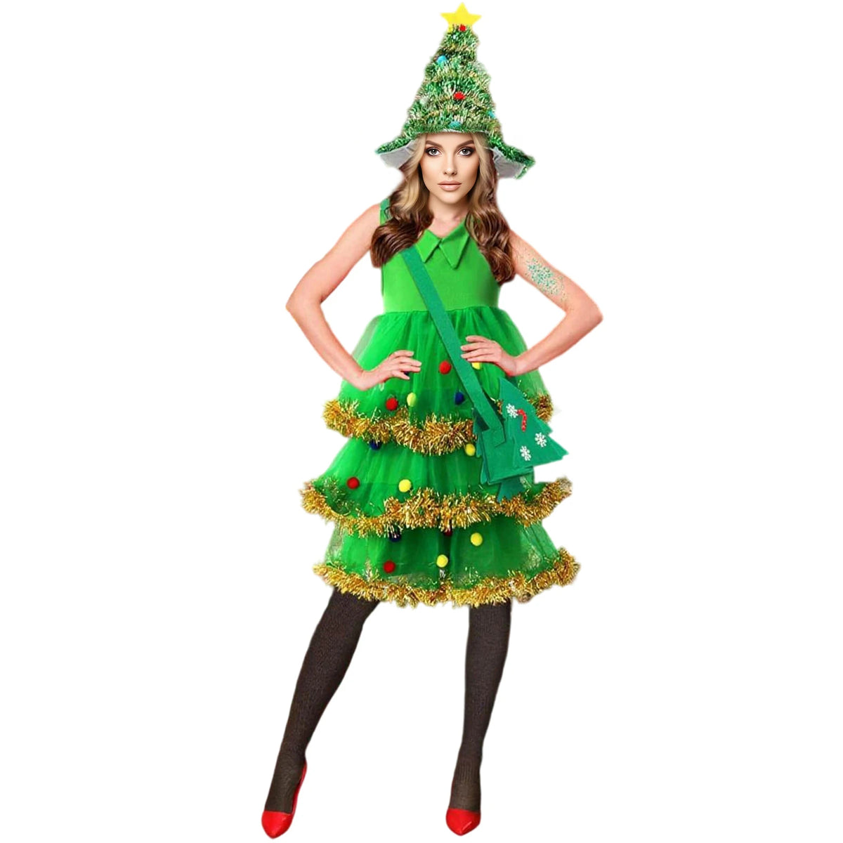 Women s Festive Christmas Tree Costume Set with Sparkling Tinsel Trim Tree Hat Dress Stockings and Matching Bag - 4 Piece - green / XL