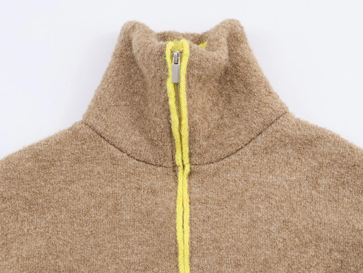 2025 Autumn New Women's Casual Fashion Simple Lazy Style Loose Color Block Layered Knitted Bomber Jacket Short Outerwear - Khaki / S