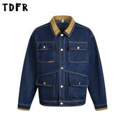 Inform when this item available Multi-Pocket Spliced Lapel Denim Jacket Mens Topstitch Retro Casual Autumn Single Breasted Long Sleeve Outerwear Man