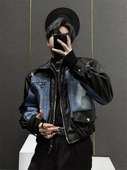 Inform when this item available Retro Patchwork Leather Denim Jaet Men's Spring Autumn ort Sle Casual Top Korean Trend Brand Straight Hemline Zipper