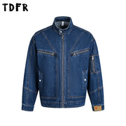 Zipper Decoration Denim Jacket Mens Spliced Retro Washed Distressed Stand Collar Long Sleeve Loose Jeans Jacket Man - Blue / M