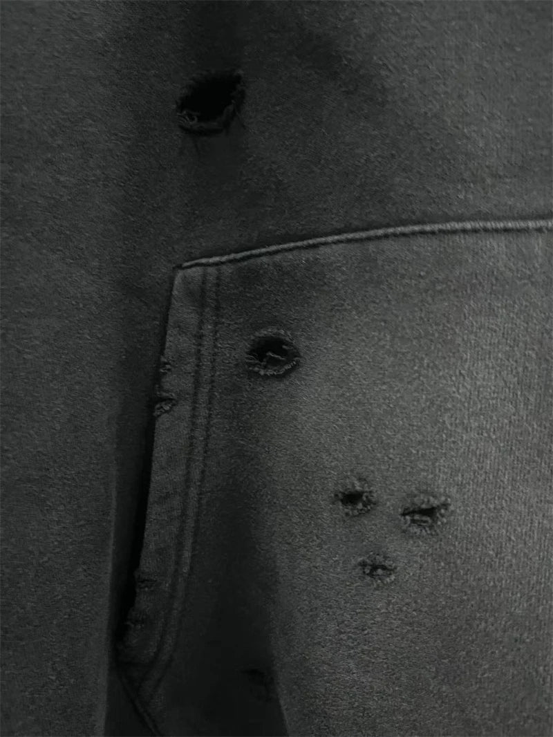 New VTG Saint Letter Logo Print Washed Hoodie Cotton Casual For Men Women Hip Hop Oversize High Street Damaged Hole Streetwear - Black / S