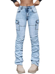 Inform when this item available New Women's High Waisted Elastic Multi Pocket Workwear Jeans, Street Fashion Casual Slim Fit Stacking Pants
