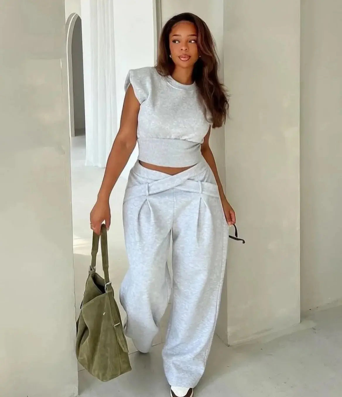 【2025 Sommer Ny】Mode Top og Høj Talje Lige Bukser Sæt til Kvinder - Afslappet Træningsdragt To Dele Outfit | Ensfarvet/P - grå / M / USA