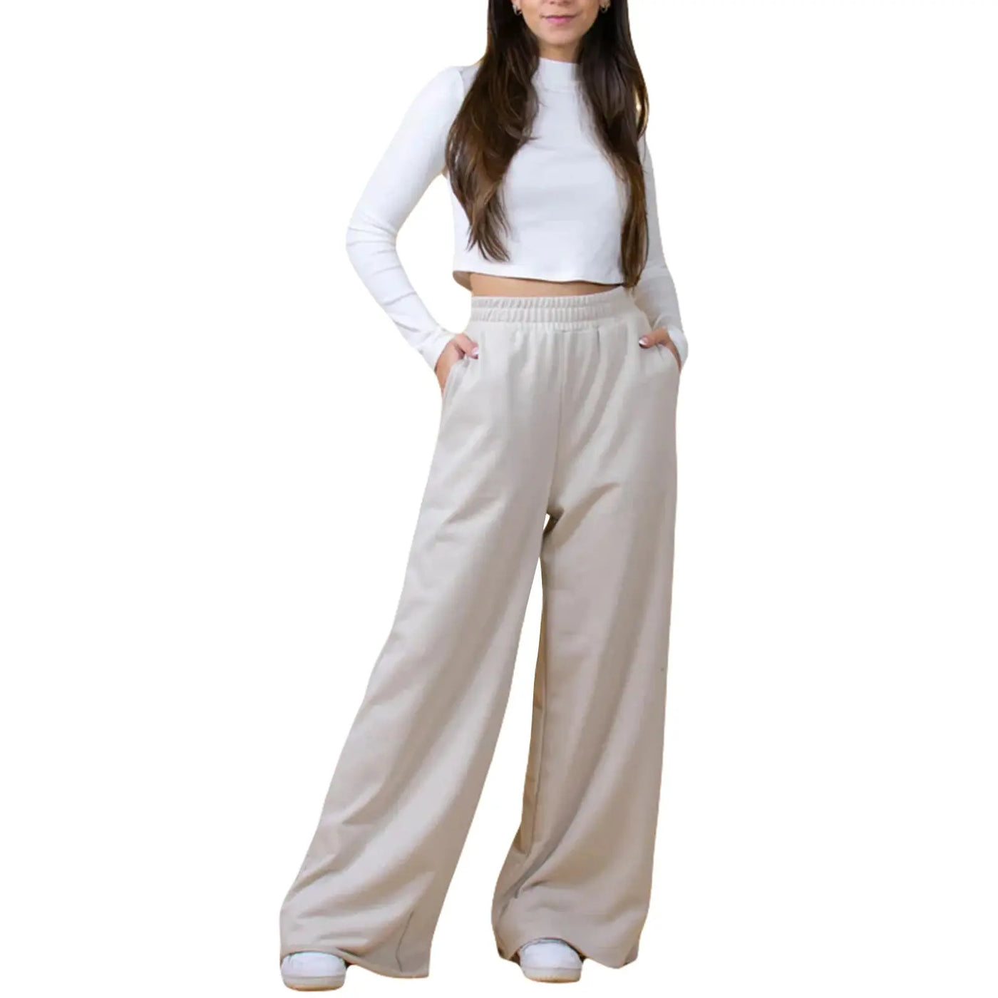 Damebukser med høj talje og vide ben i ensfarvet, elastisk taljebånd, løs pasform, afslappede efterårssweatbukser med lige ben
