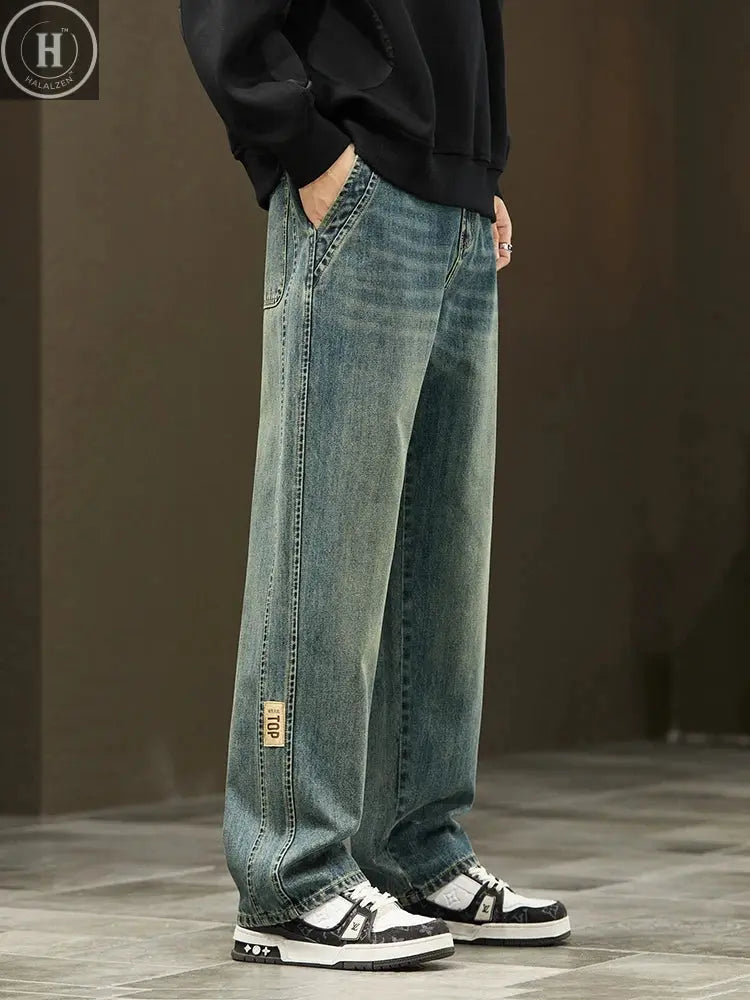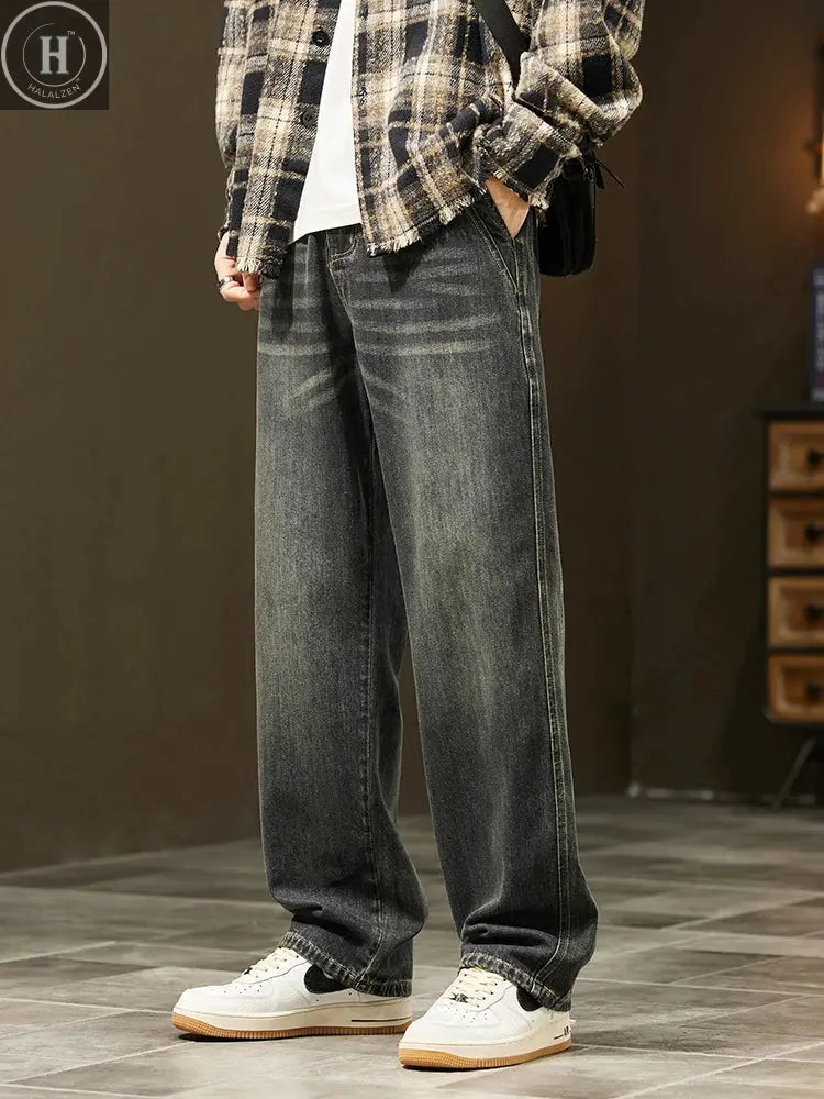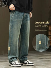 Inform when this item available Koreanische Jeans mit weitem Bein, Vintage-Waschung, Herren-Denim-Hose, Streetwear-Style, lässig, Baggy Straight Hose