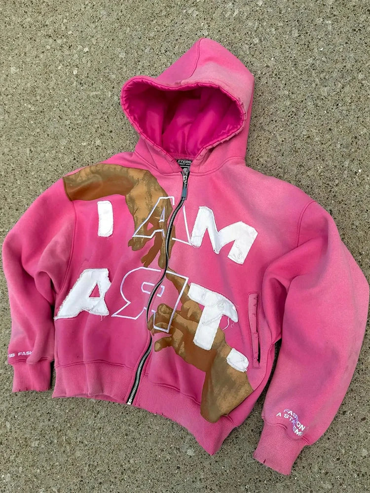 Trendy Baggy Hooded Cardigan Mens Y2K Pattern Print Loose Zip-up Hoodie Sweatshirt Men Spring Hip Hop Long Sleeve Hoodies Unisex - 03 Pink / M