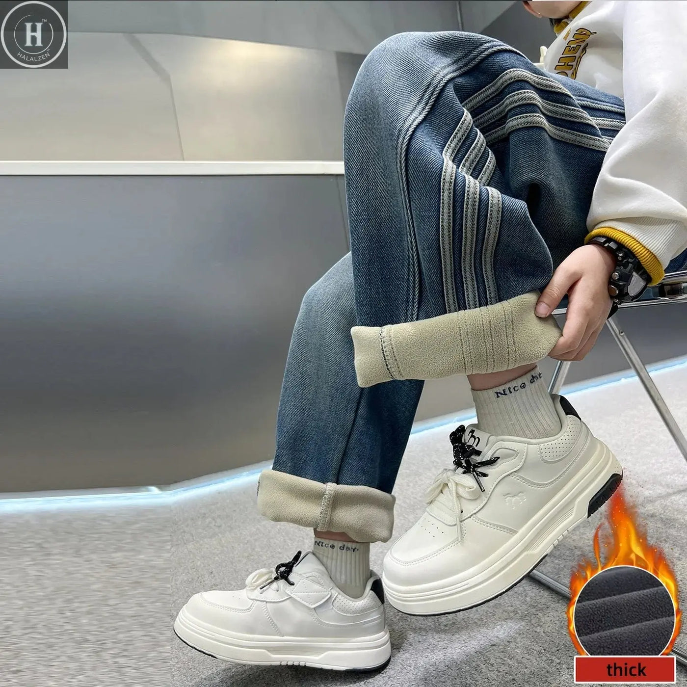 Informar quando este item estiver disponível Calças de Inverno Quentes para Meninos, Jeans com Forro de Lã, Listradas, Tamanho Solto, 5 a 16 Anos, Calças Grossas e Casuais com Faixa Lateral Decorativa