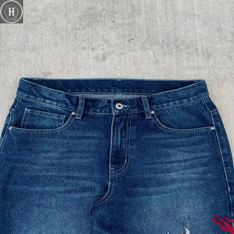 Meddela när denna vara finns tillgänglig Drakgraffiti Broderi Mörkblå Lösa Vida Jeans Slitna Y2K Hög Midja Herr Dam Vintage Ledig Daglig Gatuklädsel