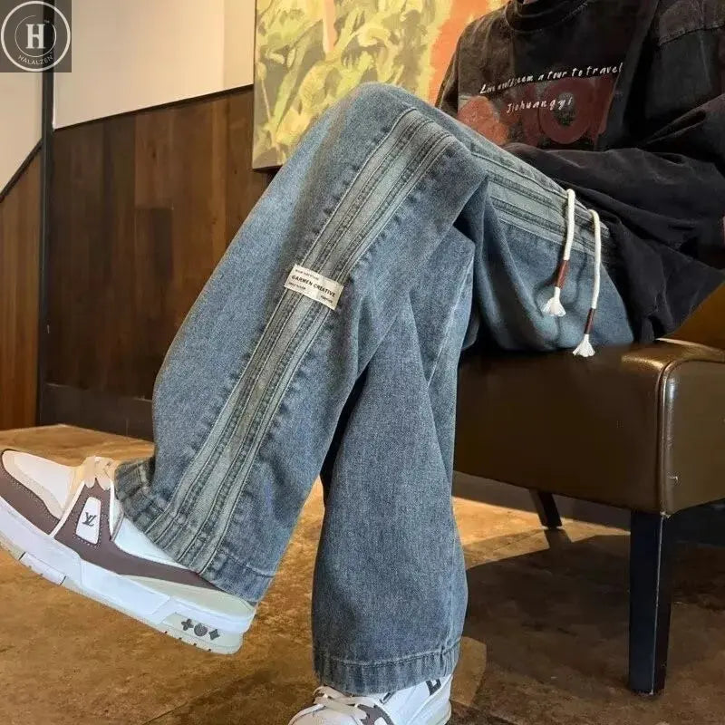 Meddela när denna vara finns tillgänglig Tre randiga amerikanska retrojeans för män vår och höst ny stil hög gatustil elastisk midja lös ledig rak ben lång