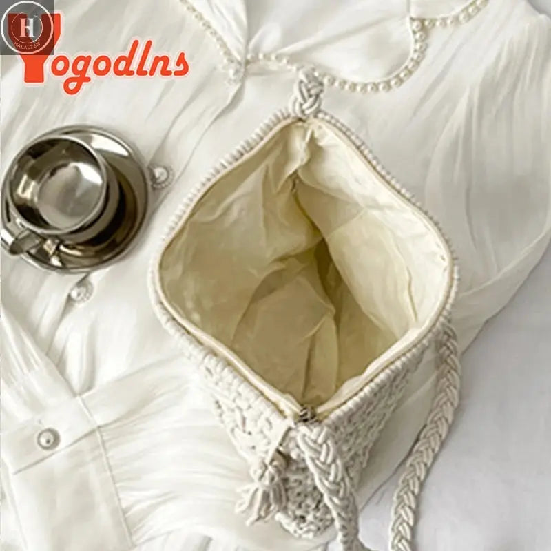 Summer Hollow Straw Bag For Women Tassel Decors Shoulder Messenger Bag Travel Beach Bag Daily Cotton Rope Crossbody Bag - white / 26x3x20cm