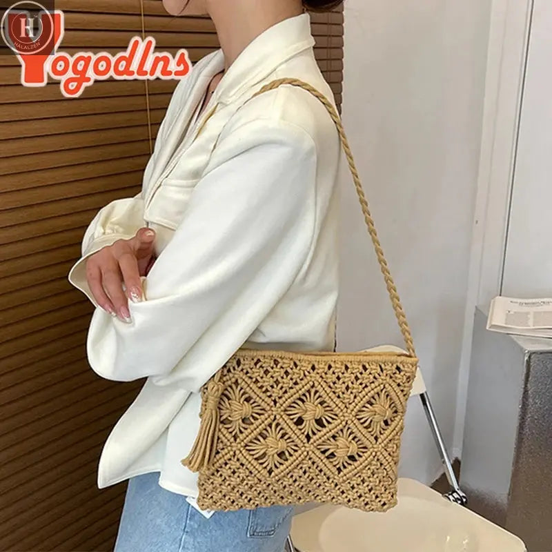 Summer Hollow Straw Bag For Women Tassel Decors Shoulder Messenger Bag Travel Beach Bag Daily Cotton Rope Crossbody Bag