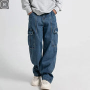 Erkek Bol Kesim Geniş Kargo Kot Pantolon Geniş Sokak Stili Hip Hop Pantolon Harajuku Moda Düz Paça Siyah Mavi Salaş Kot Pantolon - Koyu Mavi / XL